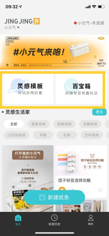 APP的二维码在包装盒后面和里面的一张卡片上都有,下载很方便。APP的风格也是偏简约日系的。里面有两个板块让我眼前一亮,一个是“灵感模板”另一个是“百宝箱”。