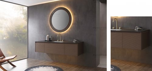 实木镜框表面做立体条纹,柜面则有细线,光影在条纹、细线的起伏中产生明暗变化的动态效果。