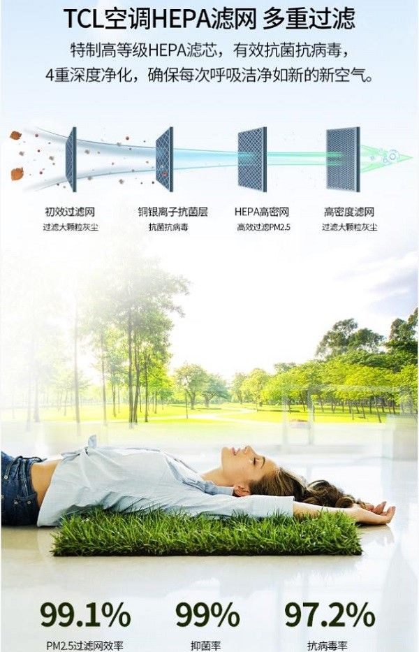 TCL卧室新风空调通过搭载集合初效过滤网、银离子抗菌层、HEAP高密滤网、高密度滤网为一体的四重滤网净化系统,能有效去除空气中的细菌、PM2.5、浮尘、甲醛等污染物。据科学数据表明,PM2.5去除率达99.1%,抑菌率达99%,抗病毒率达97.2%。此外,因为特殊的滤网设计,15秒即可完成拆卸,即使是女生也能一个人轻松搞定。配合56度高温自清洁,可以轻松清洗空调,让每一次打开都能吹出洁净的空气。