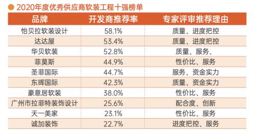 从评选结果看,怡贝拉软装设计、达达屋、华贝软装以超过50%的开发商推荐率列榜单第一、二、三位。相较去年,半数以上软装工程10强企业开发商推荐率增幅超20%,东晖国际、诚加装饰首入软装工程十强榜单。从开发商推荐理由来看,质量及服务是最为集中的两大维度。总体来看,软装工程行业竞争依然十分激烈,暂无绝对行业龙头出现,市场还将面临新一轮的洗牌,未来两年仍是市场抢夺战非常重要的年份。