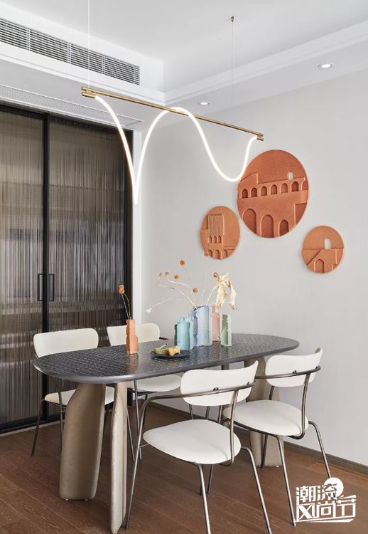 餐厅以独特的线性吊灯和鲜明的陈设配色,统筹尺寸及舒适度的考量,层次感与趣味性随即而出,温馨的用餐故事于此展现。