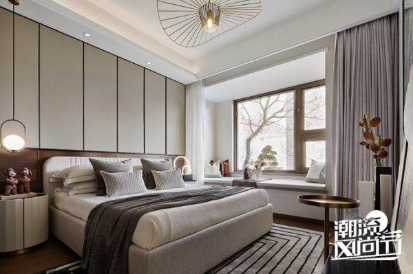 金属分隔条因势顺延至主卧,天花吊顶采用特意研发的侧边发光槽,床头则以金属网的内凹形式,呈现更广阔、丰盈的局面。硬朗的线条与圆润的软装摆件互为衬托,中性的色调、柔和的触感,自成一副恬静之态。