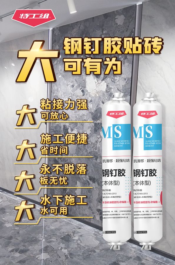 MS钢钉胶粘接力强,初始粘度高,不收缩、韧性好,水中亦可施工,耐高温达200℃以上,抗老化性能优越、不透底、不透黄,安全有保障。