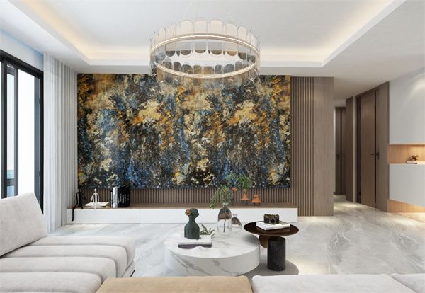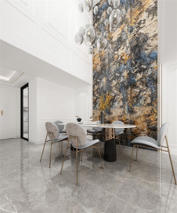 将活力四射的岩板背景墙投注到沉静内敛的高级灰空间,可以最大程度地点燃空间中的动感因子,使家居空间焕发迷人的性感活力。同时,800X2600mm的规格,适合国内住宅户型,上墙一片到顶,少拼接、少砖缝,弘美大气。