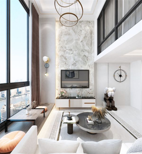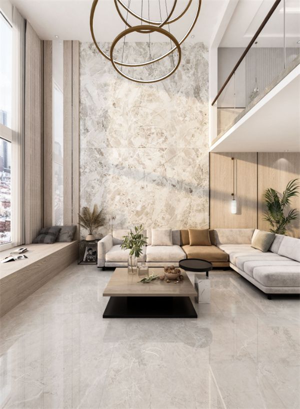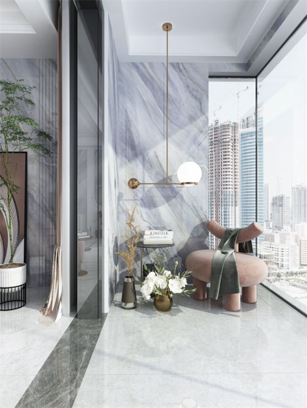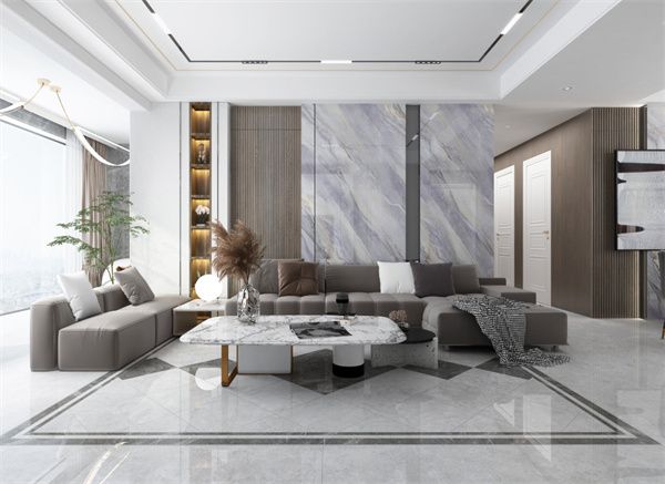 浅灰的色调与雪晶体的碎片纹理融合出一种低调的奢华感,1200×2700mm的大规格,一片到顶,将玛瑙灰的磅礴大气展露出来,让空间整体连贯性更强,如同一幅艺术巨作,让整个客厅多了一份艺术气息。