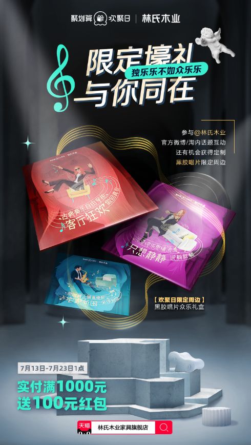 同时,不拘一格的林氏木业希望以回归经典的方式打破千篇一律的生活场景,用黑胶唱片概念唤醒一代年轻人的年幼回忆,所以在欢聚日期间,特别推出限量100张的黑胶唱片作乐礼盒,通过年轻用户演绎100种寻欢作乐的生活方式。活动期间参与林氏木业官方微博/淘内话题互动,即有机会拥有这张诚意满满的黑胶唱片,让怀旧经典浪漫满屋。