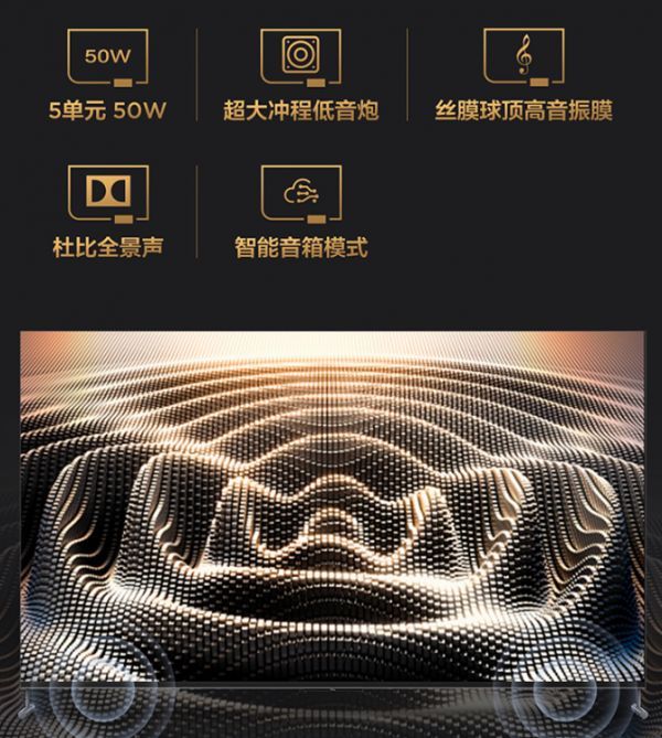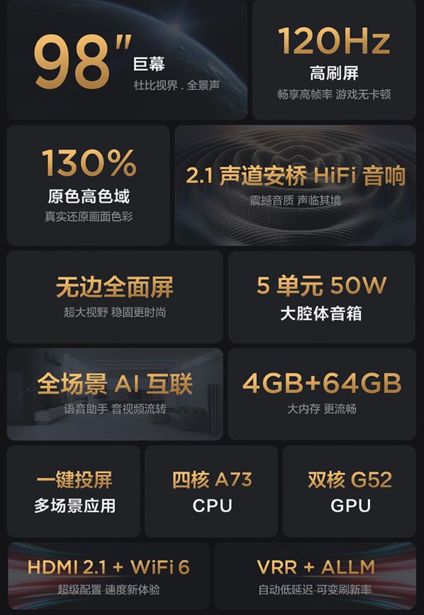 而且除了这三个感知很强的亮点,TCL98Q6E的其他亮点也不少,画质方面,采用直下式背光,拥有192个背光分区,峰值亮度650尼特,支持杜比视界及HDR/HDR10/HLG等多种HDR格式,另外支持MEMC运动补偿,色域为130%(BT709)。音质上采用2.1声道安桥HiFi音响,5单元扬声器输出功率达50W,支持杜比全景声及智能音箱模式。