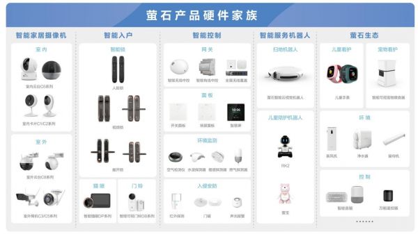 萤石四大自研品类各有千秋。智能家居摄像机形态、性能各异,为用户提供以可视化安全为基础的关爱、沟通、分享服务。智能入户主要包括智能门锁、智能可视猫眼、智能可视门铃等,通过视觉技术构建家门口的“安全哨台”,让用户第一时间掌握门外异动,守护归家每一步。萤石智能传感、智能屏、智能开关和智能插座等智能控制产品,通过传感与控制,能源管理、灯光控制、传感联动,为房子装上智慧大脑,让用户随心掌控自在生活。智能服务机器人主要包括陪伴机器人、扫地机器人等,基于萤石智能视觉、AI算法能力,为用户提供家庭清洁及个性化儿童教育陪伴服务。