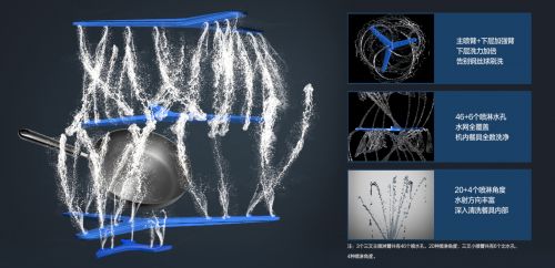 这款洗碗机,工作时水温可以达到72°高温,具有36000Pa高压水流,为三叉喷淋系统注入非凡动力,即使是干结的顽固油污也可强力洗。洗碗机内部在清洗时将形成360°无死角覆盖的高压冲淋水阵,深入清洗餐具内部,让深层油污无处可藏。