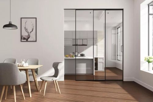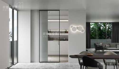 在厨房和餐厅之间安装一道活动的玫瑰岛全景门作为隔断,烹饪时不仅能阻隔油烟扩散,而且能保证厨房的采光,使整个餐厨空间更加通透明亮。