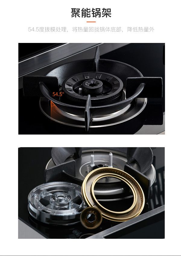 在达到4.6kw大火力的前提下,优格集成灶配置了聚能环锅架,精心打造54.5°的聚能锥度,热能有效聚拢至锅底,抗风能力强,防止热能不必要的流失,燃烧热量集中向上!