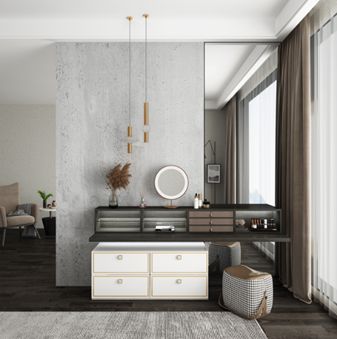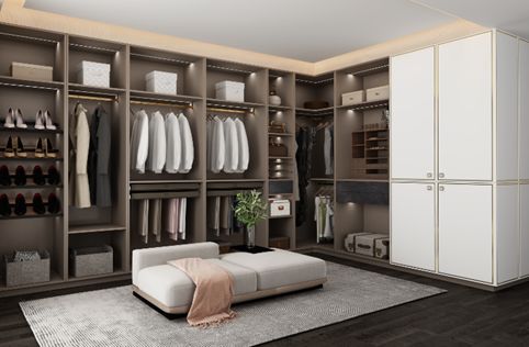 还有半开放衣帽间的不俗品味,一目了然的空间拿取衣物省去开门环节,清晰明了的男女区分,互不干扰,共同打造生活的井井有条。从造型设计到颜色搭配,从功能实现到空间解决,未央在柏厨家居独到的设计下,呈接古意,焕发新生,打造了与众不同的现代家居时尚。
