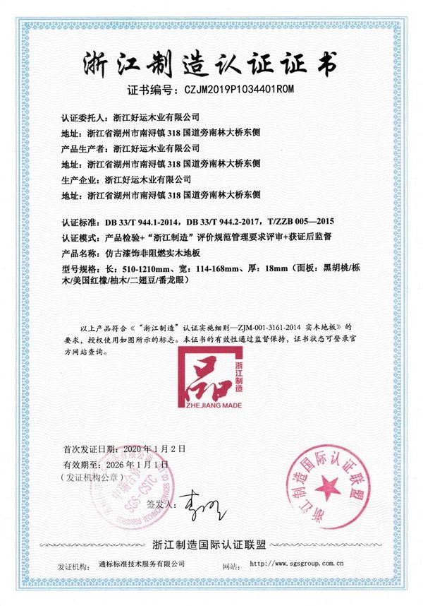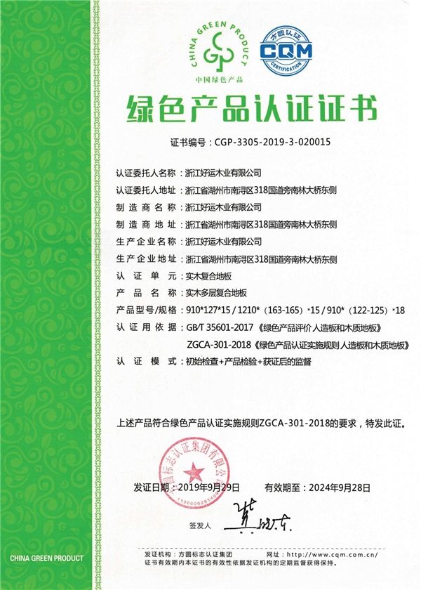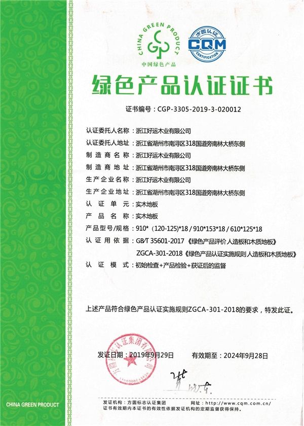 今天小编想说的是,好运地板收入囊中的这两项荣誉,即便是《广告法》也得承认确实牛!其一,好运旗下的实木地板和实木复合地板成功通过了“绿色产品认证”,其二好运地板顺利通过了“浙江制造”品字标认证。