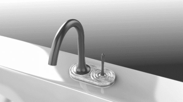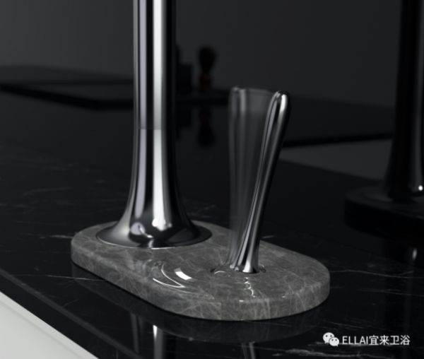 龙头把手为仿生水滴造型的拨杆,手拨动拨杆实现水流开关,纤细圆润造型,让人联想到仕女柔荑,和坚硬的金属石材结合,力量与柔美,相得益彰。