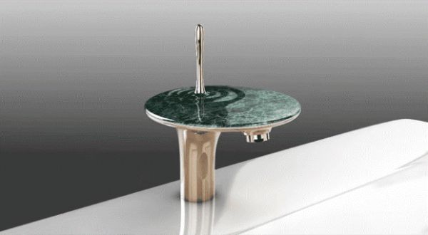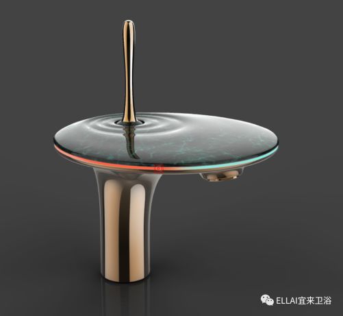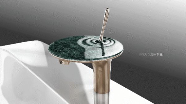 采用了天然大理石镶嵌在金属材质上的特殊工艺,先进的防水覆膜工艺使得表面温润光泽,连接处设有一圈灯带,通过内置微型水力发电设备,使其颜色随着水温的变化而渐变。金石结合,工艺精巧,展现出传统文化与时俱进的独特魅力。