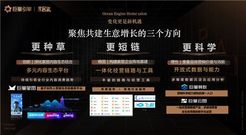 通过更种草、更短链、更科学的营销策略,家居行业可以一站式达成数字资产高效积累、阵地经营不断强化、营销效能持续提升等多元目标,逐渐开辟经营、获客的新场景,激发生意增长新可能。