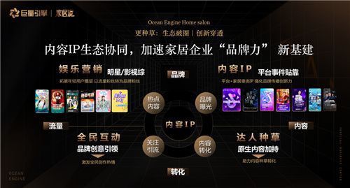 巨量算数数据显示,抖音平台目前已形成繁荣的内容创作者生态,其中家居创作者超过1530万。除了创作者之外,越来越多的家居企业也入驻到抖音平台,联手平台探索出了跨圈营销、明星合作、IP合作等丰富的整合营销形式。此外,基于电商节点以及重大营销节点,巨量引擎还会通过娱乐营销、内容IP、全民互动、达人种草等形式,帮助品牌实现不同的营销目标,拓宽与消费者的互动渠道。