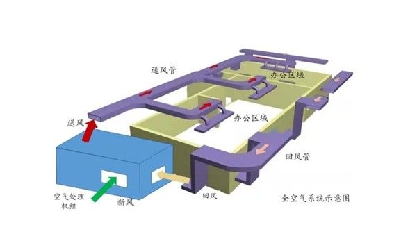 现如今,大部分办公楼所用的都是中央空调,主要是由风机盘管(多联机)+新风系统或全空气(变风量)系统组成,而风机盘管或多联机在本质上与普通分体空调区别不大,每个房间有一个室内机,通过将室内空气不断循环流动实现温度调节,对于室内空气质量并没有很好的优化效果。