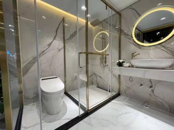 领和整体卫浴主要以聚氨酯复合瓷砖体系为核心产品,例如本次的展品就是底盘、壁板全为陶瓷大板复合聚氨酯而成。聚氨酯具有填充致密、快速、轻质高强等优点,复合瓷砖可有效减少踩踏空洞感,加上多重防水设计与专利地漏,彻底消除渗漏隐患。通过工厂预制、现场干法施工,2名工人4个小时即可安装完成,为客户带来全新的整体卫浴新体验!公司目前有5条生产线,每年产能约为3~5万套,可满足市场全方位需求!