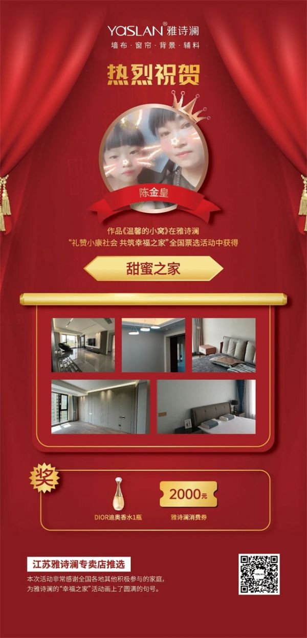 此次活动已圆满结束,接下来家人们都将获得雅诗澜公司提供的丰厚奖品。我们衷心感谢业主家人们使用雅诗澜品牌的产品对家进行精心的装饰,并与大家共同分享家的幸福感,这也是业主家人们对雅诗澜品牌产品的肯定和认可。