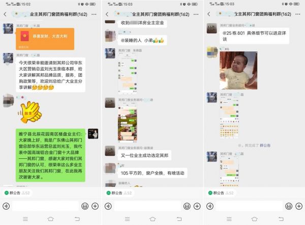 然而,如何才能在竞争激烈的市场环境中精准触达C端,让更多的业主了解品牌、了解产品、了解活动,从而促成成交?江苏睢宁其邦门窗专卖店给出了一个非常有效的办法——社群营销。
