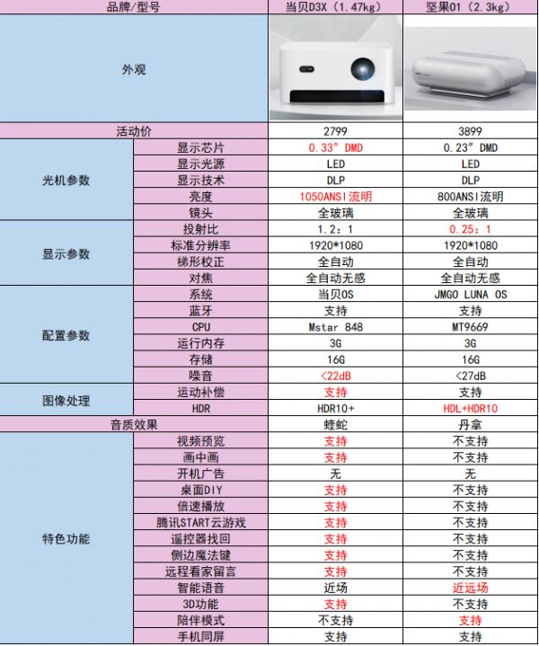当贝D3X的噪音参数更低,但差别不大,这里就不多说。