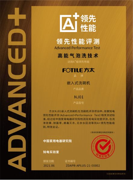 日前,中国家电研究院通过N系列嵌入式洗碗机的专业评测,给出A+证书;权威评测机构知电实验室也得出方太嵌入式洗碗机N1(已于五月上市)是2021年知电实验室测试结果中,洗碗机大品类综合性能排名第一。