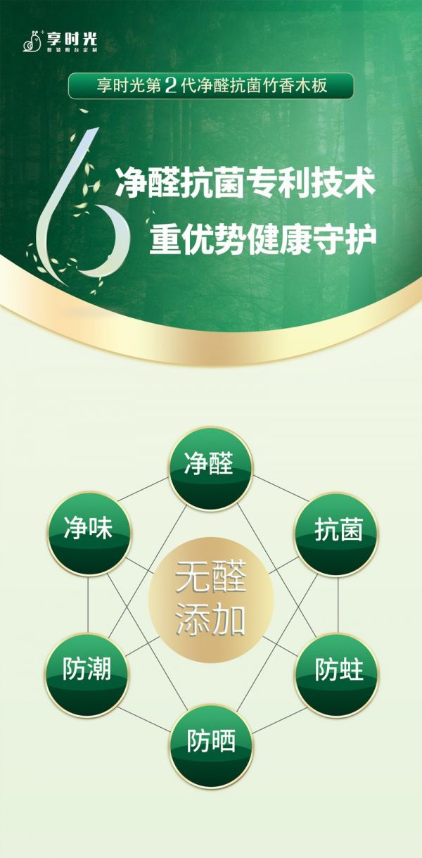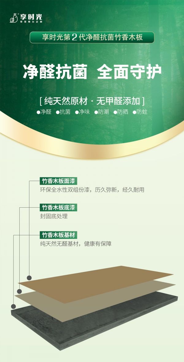享时光新一代净醛抗菌竹香木,从源头上实现零醛添加,不仅具有超强吸附力,还具有防潮防晒防蛀等优越性能,将净醛、抗菌、净味、防蛀、防晒、防潮等居家问题考虑得面面俱到,旨在为每个家庭健康的阳台生活保驾护航,不断提升全民家庭的健康幸福指数!