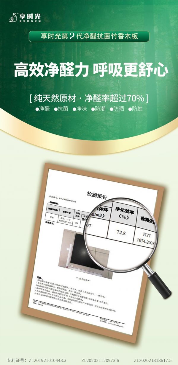 享时光新一代净醛抗菌竹香木是以天然竹木为基材,优先4年以上毛竹,经千度高温缺氧炭化,完成从有机物转化为无机矿物;再经过独有专利配方和专利技术,制成高环保标准板材。