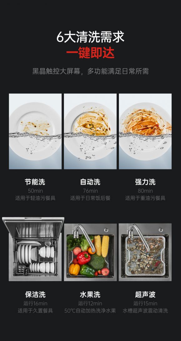 对此,默克菲尔免清洗洗碗机洞悉用户清洗需求,拥有节能洗、自动洗、强力洗、保洁洗、水果洗、超声波洗等6大清洗模式,一键即达,操控起来简单便捷。而黑晶触控大屏幕,操作模式一目了然,上手快速。