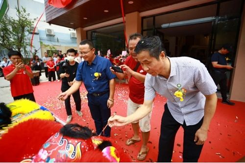 广东亿润网络技术有限公司董事长彭建才、董事李家瑩,与各合作伙伴为窝托邦高端家居服务体验馆的开业完成剪彩仪式。