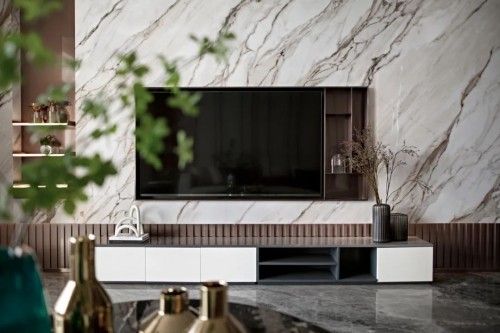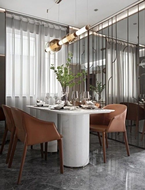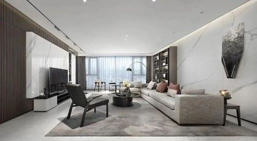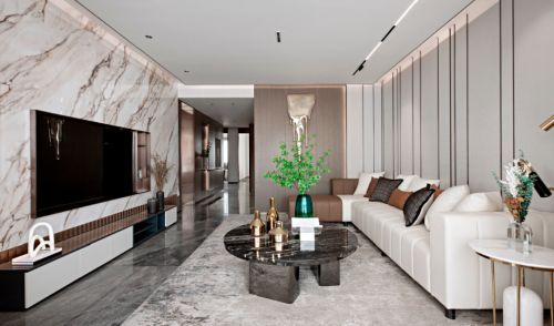 客厅墙面选用大理石去诠释墙体的丰富性,迥别于传统瓷砖的冰冷感,更为斑斓生动。渗透柔和光线,折射出另一番空间,虚实之间,自有乾坤。