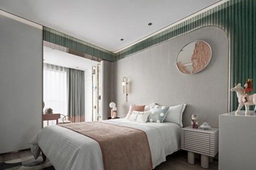 移步换景,随光而行。与其他空间不同的是,儿童房以莫兰迪色为基调,充满着孩子般的童趣与大自然的气息。一抹绿色是跳跃的音符,谱下一片充满光的小天地,传递情景感与情绪交错的空间。