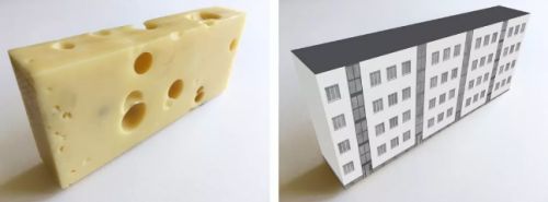 奶酪上的洞是圆形的,分布不规则。而在建筑立面上,洞即是窗洞,但很少是圆形的,通常是有边有角的,均匀排列着。所以,一块带有“窗洞”的建筑平面与一块奶酪切面有着明显的不同。奶酪的“窗洞”有时大、有时小,有时是孤立的,或者有时看起来像完整的一组。这种分布就使得奶酪看起来很有趣。而由于建筑的统一性,外墙立面往往显得单调乏味。