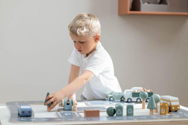 FLEXA/芙莱莎儿童家具的这套轨道车玩具有十分多样的组件。汽车组件中包括四台复古的木制汽车:跑车、面包车、汽车和大篷车。这些都可以帮助孩子提高精细运动技能。马路组件由双面打印的轨道碎片组成,孩子可以轻松构建一条又长又直的公路、盘山公路、或矩形的轨道。马路配件包含微型树木、灌木丛、交通锥和路标,可以完美地作为玩具马路的补充。卡车木质玩具可以让孩子模拟废品回收,配备了车辆、垃圾箱、容器和吊车组件。集装箱货轮玩具则配备了几个颜色不同的集装箱和回收箱。以上这个组件可以独立也可以互相搭配玩耍,给孩子不同的玩耍乐趣。