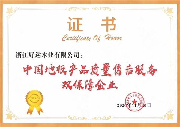 自2012年始,好运地板凭借突出的企业实力成功跻身地板行业30家“双承诺”舰队,并连续八年摘获“中国地板产品质量与售后服务双承诺企业”奖项。