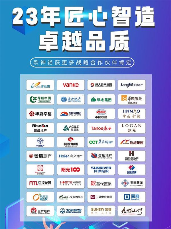 欧神诺瓷砖创立23年以来,始终执着于“美化人居环境”的企业使命,不断创新前行,创造质量上乘的产品,并以优质的服务,与万科、碧桂园、恒大等世界500强地产企业达成战略合作。