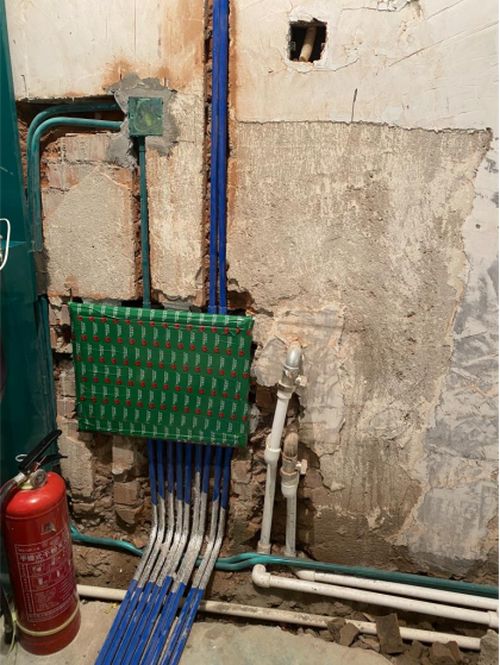强电箱设置:由于日常生活中强电箱查看频率低,设置在冰箱上方不影响其他设施使用。强电箱排线布局:每根线管之间留出一公分左右的距离,以便在水泥砂浆涂抹环节能够将水泥砂浆涂到每个缝隙,保证以后墙体不开裂。