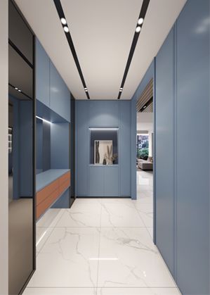 打开家门,步入玄关空间。首先映入眼帘的是蓝橙互补色的对开门隐藏柜,整块的门板与护墙板和谐统一,营造出整合划一的空间感。海量的收纳空间帮忙理清生活的琐碎,一推开柜门就能看见的蓝橙互补色将成为你对家重要的记忆点,日复一日,第一眼就能得到的视觉刺激将下意识的安抚你忙碌的心灵。嘿,到家了,一切烦恼请寄存在门外,生活的压力明日再继续。