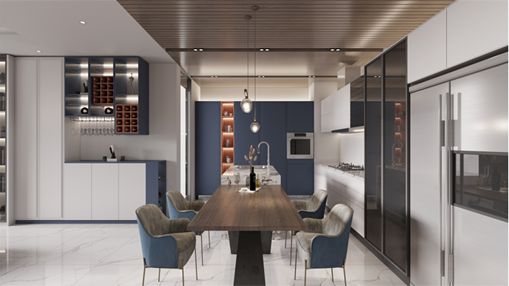 厨餐厅的设计增强了生活的幸福感,整个厨房空间采用中西双厨设计,满足了当下很多家庭多元化的烹饪需要。白色的主色搭配大理石纹让“L”形的厨房更显通透干净;餐边柜则采用橙色的开放格设计,补充了空间的活力,视觉效果呈现出轻盈灵动之感,让心情都好了几分;餐厅的酒柜彰显出主人的生活品味,错落有致的开放式酒架格搭配酒杯架,兼具收纳和展示两种功能,高低不同的酒格满足不同身高的人拿取,再搭配玻璃层板设计,凸显出高级质感。整个厨餐厅分区泾渭分明,功能齐备,无论是日常中西餐烹饪还是做一份轻食简餐,亦或是周末的亲子烘焙时间和亲友到访时的小酌,蓝调都有精致的解决方案。