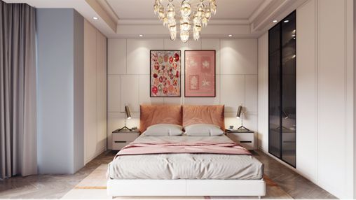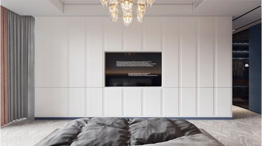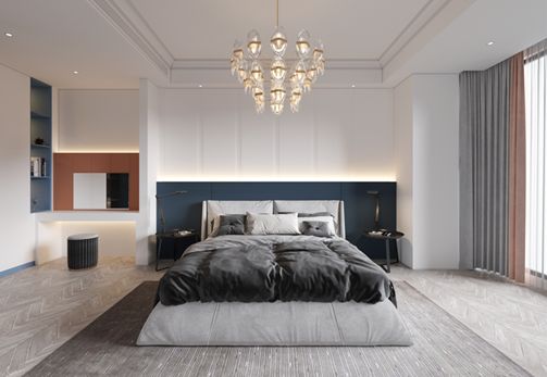 主卧室的设计考虑周全,细节之处尽显精致和人文关怀。与女儿房靓丽橙色不同,主卧的护墙板采用蓝白撞色为主再搭配暖光灯,营造出温馨舒适的氛围。夜幕降临,在温暖的灯下安静的看书是一种极好的放松,沉稳的色彩可以促进心理感受趋向平和,温馨的环境洋溢着令人放松的感觉,心里就算有负面情绪,家都会帮您轻松排解;电视柜则以白色为主,中看腰带式分割,打破空间的沉闷感。
