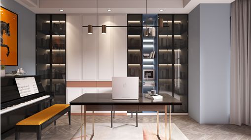 女儿房的设计别具一格,为了给孩子一个良好的成长空间,也为了空间的层次感,蓝调别具一格的使用了护墙板设计,让空间分割更显灵动,将张弛有度的生活诠释的淋漓尽致。以白色为主的拼色设计,橙色和蓝色的跳色碰撞,再搭配灰色玻璃门,衣柜的设计有露有藏,超大的收纳空间可以装下孩子一路的成长;重头戏是书房,以白色门板搭配灰色的玻璃,再点缀以橙色腰带设计和蓝色开放架,有藏有露,虚实结合,展示的空间既可以放书也可以放一些摆件,成为整个空间的装饰。