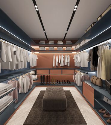 衣帽间被设计成全开放模式,超大比例的挂放区容纳一年四季,同时还能做到当季衣物和过季衣物分开收纳,方便生活;还有专为女主人设计的专属包包展示区、首饰收纳区和长靴展示区。蓝调极尽细致的提前规划了各类物品对收纳空间的要求,并科学合理的安排分类收纳,有条不紊,一目了然。
