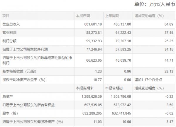 公告显示,报告期内顾家家居股份有限公司实现营业总收入801,601.10万元,同比增加64.89%;营业利润88,273.81万元,较上年同期增长37.45%;公司利润总额99,332.93万元,较上年同期增长25.25%;归属于上市公司股东的净利润77,246.94万元,较上年同期增长34.15%;基本每股收益盈利1.23元,同比增加28.13%。