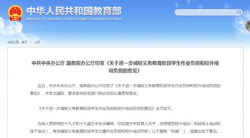 近日,为了减轻义务教育阶段学生的学业负担,我国出台了“双减”政策,校外培训、家教全部喊停。