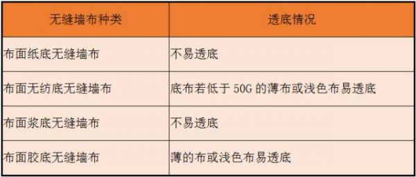 相对比较纸底和涂层底的无缝墙布不易透底。另外两种施工前要注意墙面的色差,如果有修补过的墙面或顶棚处5~10cm乳胶漆印子的墙面,施工前就要注意墙布是否会有透底的现象。