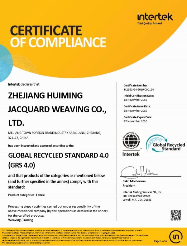 GRS 认证体系是以诚信为基础的,包括可追溯( Traceability) 、环境保护( Environmental) 、社会责任( Social) 、再生标志( Label) 及一般原则( General) 五大方面的要求。汇明A+墙布面料在2019年11月通过全球回收标准,获得GRS认证,为产品的绿色环保再添保障。