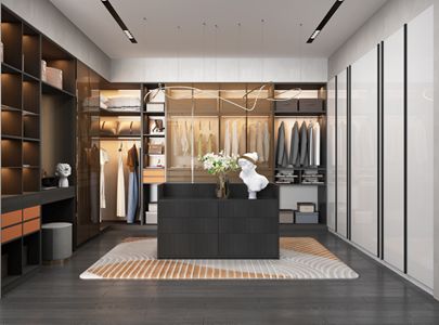衣帽间整体空间线条设计流畅,提升空间的和谐统一性,撞色设计打破空间的沉闷感,视觉效果更加灵动、和谐、舒适,似江南的水——柔美多情、灵动俏皮。“足下蹑丝履,头上玳瑁光。腰若流纨素,耳著明月珰”,醉花间Ⅱ女士区设有专属梳妆台存放女性的化妆品、梳妆和饰品,开放格收纳女士帽子、包包等高频使用物品,一目了然,随手拿取更加方便;男士区足够的收纳空间为西服、西裤、衬衫、领带以及过季物品的存放提供了绝对空间,春衫飘举凸显绅士风格。越过“翠屏”,沿途“屈曲”,意气风发的江湖儿郎与巧笑倩兮的美女相遇于推拉镜前,情意绵绵。