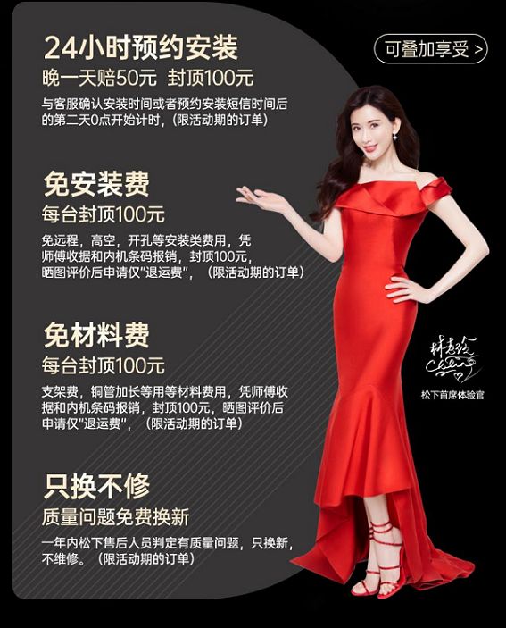 保时效。买空调,最怕的就是等安装。松下健康空调客服在客户签收后主动联系客户确认安装时间,24小时预约安装,晚一天赔50元,封顶100元。