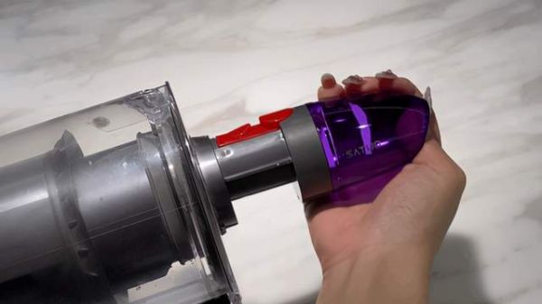 下面来测试一下实际效果。我拿的是家里的戴森V15,先试一下收纳被子的效果。首先是把鲨吸头装到戴森的头上边,跟换其他的刷头完全一样的方法,对好轻轻一摁,咔哒一下就装好了。
